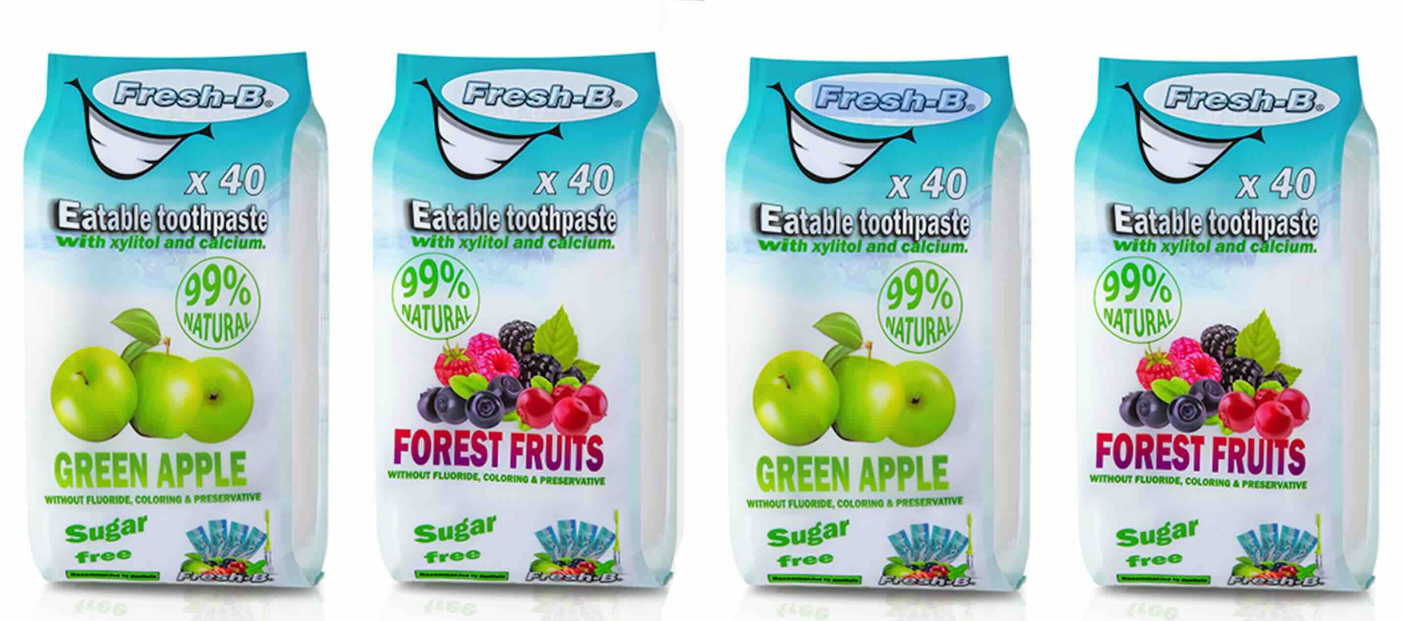 chaque sac contient 40 doses de dentifrice comestible Eat & B-fresh + une brosse à dents pliable