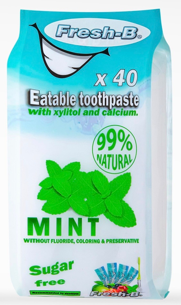chaque sac contient 40 doses de dentifrice comestible Eat & B-fresh + une brosse à dent pliable
